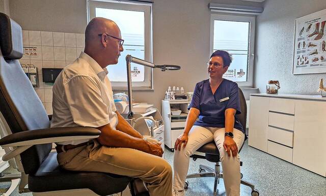 Pritzwalks Bürgermeister  Ronald Thiel zu Gast in der neuen Praxis von Podologin Doreen Ziesche. Foto: Stadt Pritzwalk