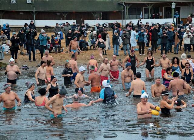 Bei nur zwei Grad Lufttemperatur und einem eisigen, stürmischen Westwind hatten die beiden mit nur wenigen Teilnehmern gerechnet. Letztlich zählten sie aber weit über 300 Leute, die am Neujahrstag beim Anbaden dabei sein wollten. Die Wassertemperatur betrug drei Grad.