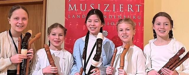Regionalwettbewerb „Jugend musiziert“: Auch das Blockflötenquintett mit Lea T. Kannenberg, Ida Landeck, Luise Schmettow, Lisa Liebert und Heidi Scholz konnte einen 1. Preis erringen. Foto: Kreismusikschule OPR Ostprignitz-Ruppin. Vom 23. bis 25. Januar fand in Rathenow der Regionalwettbewerb Brandenburg West von „Jugend musiziert“ statt. Am Start waren auch 25 Schülerinnen und Schüler der Kreismusikschule OPR, die mit hervorragenden Erfolgen von diesem Wochenende zurückkehren konnten. Denn es gab für 24 Schüler einen ersten Preis und sechs von ihnen erreichten sogar die Höchstpunktzahl. 18 Schülerinnen und Schüler werden zudem den Landkreis OPR beim Landeswettbewerb vertreten, der vom 19. bis 21. März in Brandenburg an der Havel stattfinden wird.Beim Landeswettbewerb werden außerdem vier weitere Schüler der Kreismusikschule OPR in der Kategorie „Jumu open“ antreten, für die es keinen Regionalentscheid gab. Mit diesem Wettbewerb sollen Räume geöffnet werden für eine neue Mischung aus Improvisation, Komposition und Interpretation – für neue Blicke auf Altes, für eine Mischung aus Stilen, Genres und Herkünften, für eine Anreicherung durch andere Künste, etwa durch Wort, Licht, Szene, Film und Tanz. WS