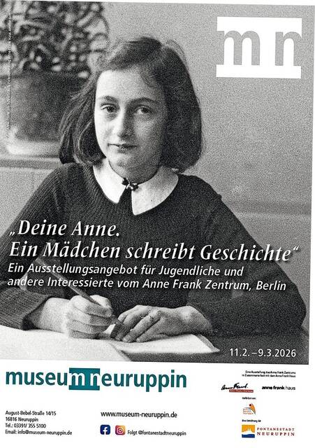 Die Ausstellung „Deine Anne. Ein Mädchen schreibt Geschichte“ erzählt von Anne Franks Leben und ihrer Zeit: von den ersten Jahren in Frankfurt am Main und der Flucht vor den Nationalsozialisten in die Niederlande, über die Zeit in Amsterdam, ihr Leben im Versteck bis hin zu ihrer Entdeckung, ihrer Deportation und den letzten sieben Monaten in den Lagern Westerbork, Auschwitz und Bergen-Belsen. Viele private Fotos geben einen intimen Einblick in das Leben von Anne Frank, ihrer Familie und ihren Freundinnen und Freunden. Die persönliche Geschichte von Anne Frank wird in der Ausstellung verbunden mit der Geschichte des Nationalsozialismus, des Holocaust und des Zweiten Weltkriegs. Neben der Perspektive der Verfolgten und ihrer Helfer wird die Perspektive von Mitläufern und Tätern dargestellt und ein komplexes Bild der Geschichte gezeigt.