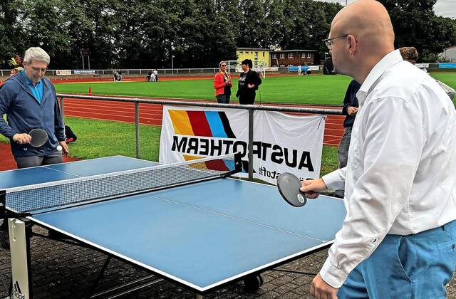 Im Tischtennismatch zum Auftakt der Veranstaltung setzte sich Landrat Christian Müller mit 11:4 gegen Wittenberges Bürgermeister Oliver Hermann durch. Fotos: Landkreis Prignitz/Bernd Atzenroth