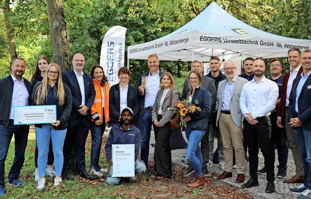 In Wittenberge überreichte IHK-Präsidentin Ina Hänsel Eggers-Geschäftsführer Marco Hamann, dem Niederlassungsleiter Domenic Krüll, den Ausbildern Phil Sader und Dennis Weska sowie den Auszubildenden den Pokal, eine Urkunde und ein Preisgeld zur Anerkennung als „TOP-Ausbildungsbetrieb“. Neben der Präsidentin und Andreas Körner-Steffens, Geschäftsbereichsleiter Bildung der IHK Potsdam, sowie René Georgius, Leiter des IHK-RegionalCenters Prignitz, gratulierten Christian Fenske, Geschäftsbereichsleiter Wirtschaft des Landkreises, Wittenberges Bürgermeister Oliver Hermann (parteilos) und Stefan Dirkes, Geschäftsführer Operativ der Agentur für Arbeit Neuruppin.