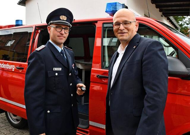 Landrat Christian Müller (r.) übergab auf dem Gelände des Sachbereichs Brand- und Katastrophenschutz den Schlüssel für das Fahrzeug an Martin Bischof von der Freiwilligen Feuerwehr Weisen.Fotos: Bernd Atzenroth/Landkreis Prignitz
