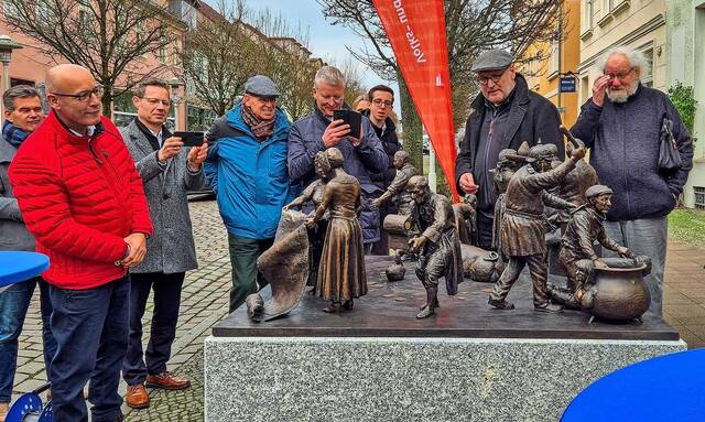 Der Künstler erläuterte an dem Tag jede Figur und ihre Bedeutung. Bei der Suche nach einem Standort für die Skulptur, die auf einem etwa zweieinhalb Tonnen schweren Sockel installiert ist, bekam die Volks- und Raiffeisenbank Unterstützung von der Stadt Pritzwalk. Dafür gab es ein Dankeschön an Bürgermeister Ronald Thiel (parteilos) und den zuständigen Mitarbeiter. Nun können Passanten oder Stadtführer am „Talerreigen“ vor der Marktstraße 27 verweilen und sich die teils humoristischen Darstellungen in Ruhe ansehen. dre