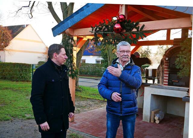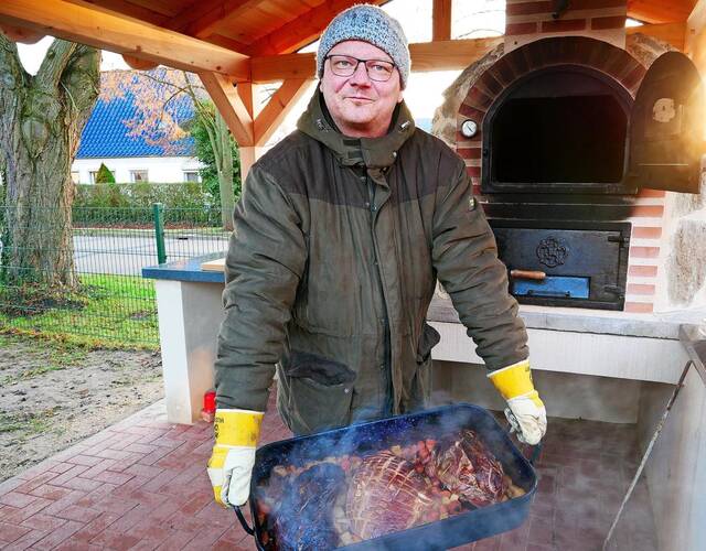 Zur offiziellen Einweihung gab es frischen Schweinebraten, Krustenbraten und Kassler, die im Ofen gegart wurden. Diesen Part hat Oliver Schulz übernommen, Sohn des Ortsvorstehers Diethardt Schulz und gelernter Koch. „Bereits um 10 Uhr haben wir den Backofen angeheizt“, berichtet er. Das Ergebnis schmeckte allen sehr gut. Die Gäste lobten den Koch und freuten sich auf die nächsten Ereignisse, bei denen der neue Holzbackofen zum Einsatz kommt. So soll auf alle Fälle hier auch Kuchen gebacken werden, vielleicht auch Brot.