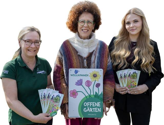 Sie laden zu den offenen Gärten in der Prignitz ein: Juliana Wendt (VR-Bank), Schirin Schahbaz (Der Alpakahof) und Katharina Christlieb (WFG) (v. r. n. l.).Fotos: Ronny Löwe, Kirsten Große (l)